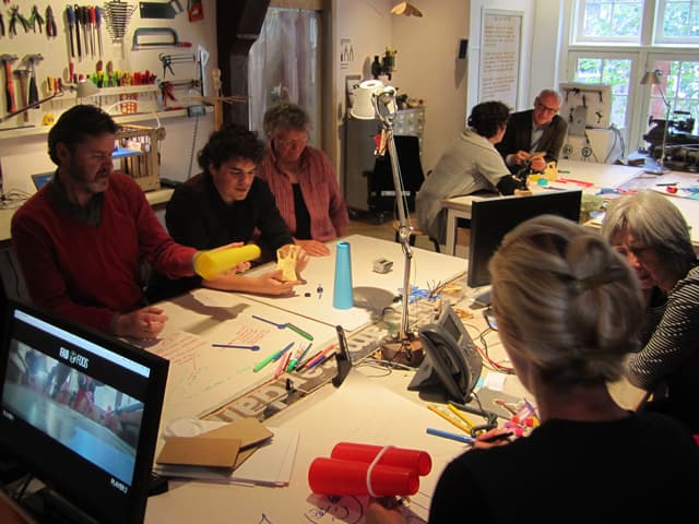 After a tour in the Waag building our concept developer Astrid van Roij-Lubsen introduced everyone to the various methods Waag applies to work with creativity. Subsequently, the 14 employees of the Ministry got assignments in which "thinking through making” was the focus point. These were preceded by an 'appreciative inquiry': an interview technique that focuses on positive experiences, such as the atmosphere and their working environment.