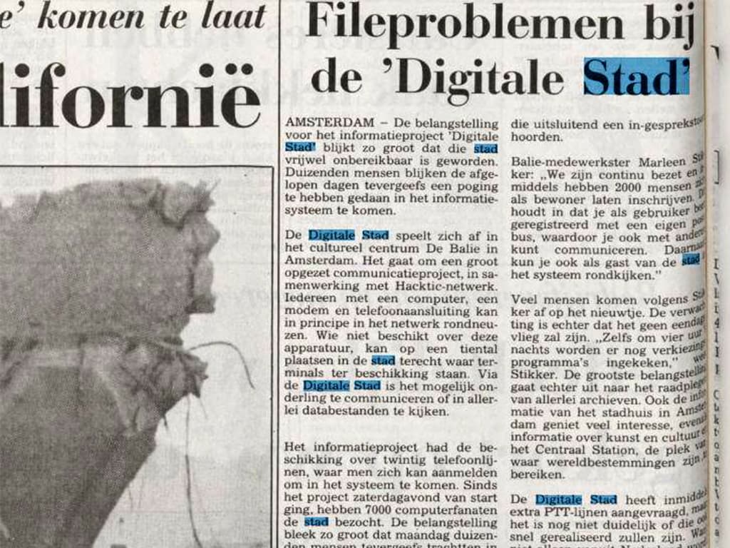 There were instant traffic jams in front of the gates of the DDS and modems were sold out soon. Hundreds of thousands of people had their first Internet experience in De Digitale Stad. It was a living laboratory where experiments were conducted with user generated content, open data, chat rooms, webcams, smart TVs and even an underground game that is active to this day. De Digitale Stad was also the place where political parties and newspapers such as the NRC, Het Financieel Dagblad and De Groene Amsterdammer made their first digital steps. The municipality of Amsterdam opened its entire administrative information system, becoming the first open government.